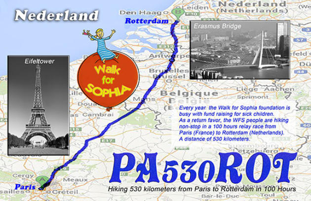 Every year the Walk for Sophia foundation is busy with fund raising for sick children. As a return favor, the members of the WFS foundation are hiking non-stop in a 100 Hours relay race from Paris (France) to Rotterdam (Netherlands). A distance of 530 kilometersIntroductionEnd October 2012, I came in touch with some members of the Walk For Sophia foundation. They were busy with fund raising making and serving dinner for my wife and me (and many others). One of the members/servants came to our dish at the community center and told us why they were serving the fine Clams-dinner. The guy was very enthusiastic, and got me so enthusiastic also that I accepted the invitation to give some help in case the foundation needed more hand-power for their activities. And my address was written down.End December 2012 the same guy ringed my doorbell. They needed one more driver to accompany hikers on their hike from Paris to Rotterdam. One hour later I was a new member of the foundation.From that moment I became again a busy man. To be a member of the foundation was not only be a companion for hikers during 5 continuous days, but also taking part in activities for fund raising. Among those activities are organizing hikes in the neighborhood, being a servant at fund-raising dinners, washing cars, organizing dart-tournaments, selling chocolates at the local hobby-market etc.. And looking for donations by visiting factories, companies, shops, craftsmen, restaurants, bars, supermarkets, etc.. I must say this activity is not my favorite one..The foundationThe purpose of the foundation is making the stay of patients of the Children’s hospital Sophia in Rotterdam as comfortable as possible. With our activities, we hope to get a smile on the face of those kids, suffering cancer. Therefore the foundation collects money. This money will NOT be us for treatments or research. Instead the money can/will be used for painting the walls, in a child friendly manner. Waiting-rooms can/will be filled with toys for the kids. Tablets, iPads, X-boxes and play stations for the kids can make in possible that they forget the hospital for a while.As a return favor for the sponsors of our foundation, members of the foundation are hiking every year (during Easter-time) non stop from Paris to Rotterdam, a relay-race over more than five-hundred-kilometers.This is the hike.At the end of this 530 kilometers relay-race, the whole hiking team visits the Sophia Child Hospital at the finish in Rotterdam. There we hand over a cheque, showing the collected money during the past year. The 2013 hike from Paris to Rotterdam was a very cold one. The hike took place in the last week of March, the week before Easter. Prior to our departure to France, it had snowed, and the weather did not improve during the 530 kilometers relay race. In Rotterdam, on April 1, we could handle over a Cheque of € 4000,-- to the staff of the hospital.In 2014, the hike did start on Wednesday, April 23 at eight o'clock in Dugny, a suburb of Paris, the capital of FrancePA530ROTErik, PD7M, one of the members of the foundation, proposed the idea to promote our foundation Walk for Sophia, by activating a special call PA530ROT, some weeks before the start of the non stop hike. If you want to support us, you can give a small donation via the OQRS system at Clublog. You can be sure that your donation will go 100% to the welfare of the kids at the hospital. The last year that PA530ROT was active is 2017. All QSO’s are uploaded to ClublogSome Motivations of the people involved. Every member of the 530 Kilometers hike from Paris to Rotterdam has another reason why he/she is a participant and why he/she collects money for the Kids of the Sophia hospital in Rotterdam. Here is the motivation of some members of our foundation.Piet K. Of course you do this for supporting charity. I like what I see in this motivated group of people. And their activities make me even more activated. I am no hiker and no driver. But I am just the treasurer of the donated and collected money for the kids.Ria. My eldest grandson is born with a handicap. He is born without a fibula bone. Now he is 12 years and a real fine sportive young man. He plays footbal and tennis, and confirms that, with good medical treatment, you can live with a handicap. Participating in the W.S.F. let me do something in return.Remco. I know how important it is for those young peole there in that hospital in Rotterdam. But I know also that being a driver during those five days of hiking is very, very exhausting..René. For me the relay race is real holiday for 100 percent. I don't like those beach-li-down-in-the-sand-holidays, but prefer the do something. And if do something is for a good purpose, like the wellfare of the hospital kids, then I have a super time. First time of participation was as a driver, but being one of the hikers is much more relaxing.May. I hike occasionally, but driving is more relaxing for me. And just as René, my husband, doing something for the sick children gives me satisfaction. Even if I must sell eastern eggs in the hobby-market.Patrick. During the last 20 years I support the Foundation against Cancer in Belgium. The enthusiasm of René and May caused me to join the WFS foundation, and take my part in collection money for the good purpose.Erik. I, myself are father of a little young boy, who has a healthy life, and who has no handicaps at all. So I feel very lucky, but realize that other parents do not have that luck. I feel it as an honor to give my piece of support to make the stay of kids at the hospital as comfortable as possible.Last remarksThe last time he Walk For Sophia foundation was active happened in 2017. The chairman of the Foundation died in 2016. Some members allready died in the years before 2017. New member were hard to find. Therefore in 2018 the decicion was made to end the Walk for Sophia Foundation.Positive diversion is good medicine, and a good step towards curing...