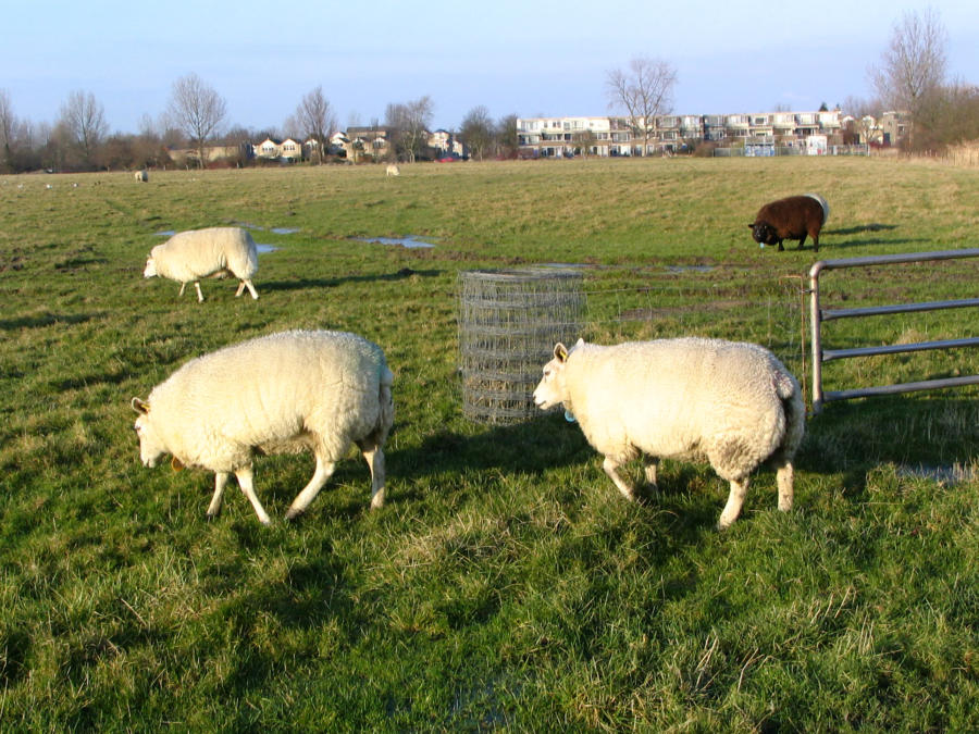 Weyenvlietpad. Bij de scholengemeenschap Weyenvliet was een kudde schapen aan het grazen
