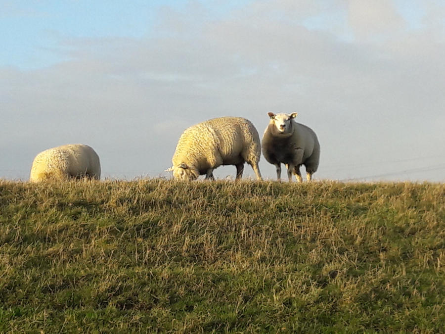 Op de dijk liggen en staan een aantal schapen. Even een