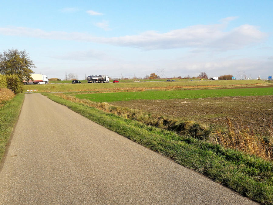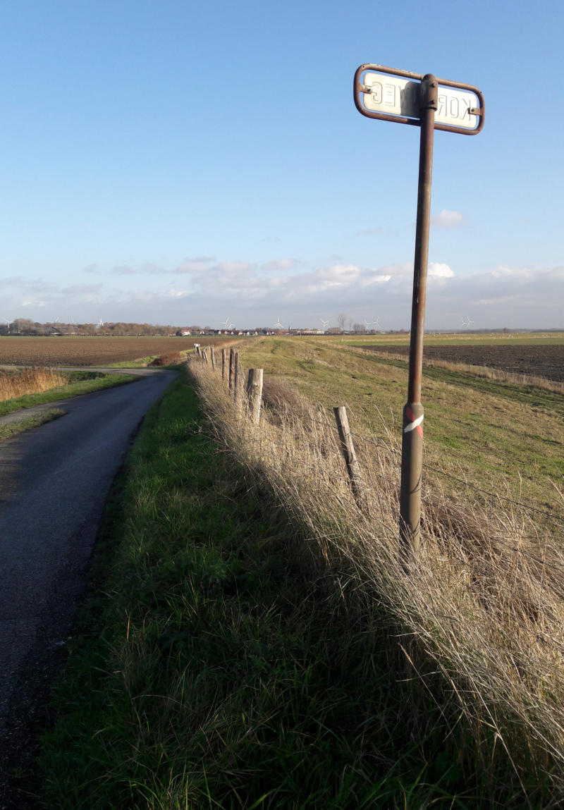 de weg naar rechts en gaat een binnendijk over. Oei problemen. Ik