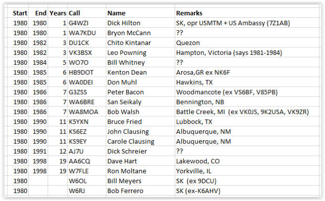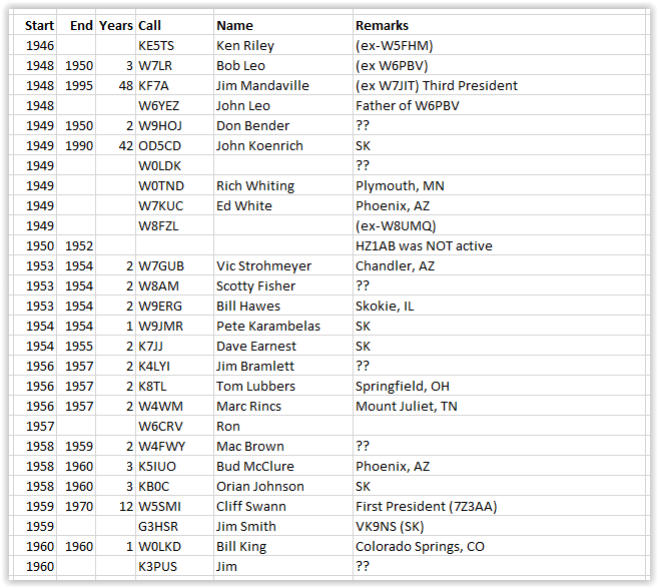 De HZ1AB operatorsgecopiëerd van QSL.NET update April 2021Het is moeilijk om een complete lijst te maken van alle amateurs die HZ1AB geactiveerd hebben in de periode van 1947 t/m 2004. De HZ1AB site (qsl.net/dhahran/ toont slechts 100 calls, maar artikelen over HZ1AB maken melding van 160 verschillende operators. En enkelen spreken zelfs van 200 operators. De tabellen tonen de calls van die operators welke ik op het web heb kunnen terugvinden.De laatste tabel laat niet zien wanneer de stations bij HZ1AB actief zijn geweest. De amateurs vertellen in hun site op QRZ.COM wel dat ze bij HZ1AB actief waren, maar niet wanneer.