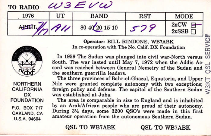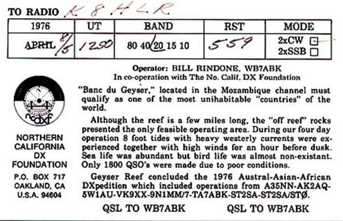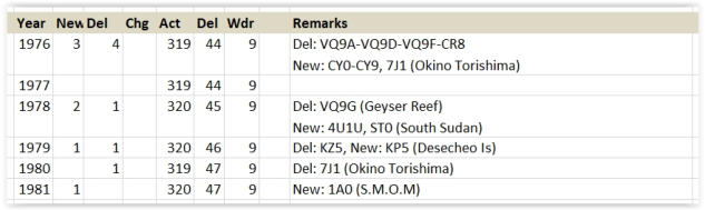 Veranderingen van 1977 t/m 1981Entiteiten januari 1977: Actief 319, Verwijderd 44, Afgevoerd 91977 was een rustig jaar voor het DXCC. Er vonden geen mutaties plaats.Entiteiten januari 1978: Actief 319, Verwijderd 44, Afgevoerd 9Geyser Reef deleted (QST januari 1978, pagina 78) A deletion to the ARRL DXCC list is Geyser Reef, deleted as of March 1, 1978, by reason of Rule 4 of the Countries List Criteria (unadministered area).‘This action brings the grand total on the ARRL DXCC list to 363; 318 current and 45 deleted’Met deze opmerking in QST is duidelijk dat de DXCC Countries List en Deleted List totalen dezelfde zijn als die vernoemd zijn op deze pagina.Op 1 maart verdween Geyser Reef (VQ9/G) naar de Deleted lijst. Madagaskar kondigde, na het vermoeden dat er olie op Geyser Reef was te vinden, de annexatie van het rif aan in 1978. Maar dat lieten de Fransen niet toe, het gebied werd gecontroleerd door de Franse Marine. En Geyser Reef hoorde volgens de Fransen bij de Glorioso Eilanden (FR7/G) . En die eilanden hoorden weer bij Reunion dat ook van Frankrijk is.Als Geyser Reef altijd een Frans grondgebied is geweest, waarom telt Geyser Reef dan toch als een aparte Entiteit van 4 november 1967 tot en met 28 februari 1978? Zouden Geyser Reef QSO’s, gemaakt in deze periode dan tellen voor een credit voor Glorioso? Al de tijd vanaf 15 november 1945?(DX is !!)Rio de Oro deleted (QST juli 1978, pagina 58) A deletion to the ARRL DXCC list is Rio de Oro, deleted as of August 1, 1978. Spain relinquished control of this area, which was absorbed by Morocco (CN) and Mauritania (5T).Deze aankondiging is ook weer een vreemde. Je vind deze Deleted Entiteit namelijk NIET terug in de Deleted List. Waarom niet? Het antwoord hierop is te vinden in de actuele DXCC list. Daar kom je de Entiteit Western Sahara (S0) tegen. Als je nu Note 1 en Note 27 leest dan is duidelijk de RIO de Oro QSO’s nu tellen als verbindingen gemaakt met Western Sahara. Conclusie: Rio de Oro kreeg een andere naam in de DXCC list. Het bericht in QST is dus wel erg misleidend. Snapt U het nog? (DX is !!)United Nations and Southern Sudan added to DXCC list (QST oktober 1978, pagina 64)Two new countries to be added to the ARRL Countries List. 4U1UN, United Nations Headquarters, New York. QSOs made on or after February 4, 1978, count for this country. ST0, Southern Sudan, QSOs made on or after May 7, 1972, count for this country.Op zoek naar DXCC gebouwenDe DXCC-Entiteit zoekers concludeerden dat, als het ITU gebouw van Geneva (4U1G) een Entiteit was, dit ook moest gelden voor het gebouw van de Verenigde Naties in New York. Dus kwam U.N. Complex New York (4U1U) op de DXCC lijst te staan. QSO’s met United Nations-HQ (4U1U) zijn dus volgens QST geldig vanaf 2 april 1978 voor het DXCCDe Verenigde Naties heeft haar hoofdkwartier in New York City in een complex dat ontworpen is door een groep architecten. De bouw erd voltooid in 1951, en is sindsdien U.N. H.Q. Ik kan er maar niet achter komen waarom 4U1UN QSO’s pas geldig zijn vanaf 4 februari 1978. Gelukkig is deze datum NIET terug te vinden in de DXCC lijst. QSO’s tellen daarom vanaf 15 november 1945, ook al stond het gebouw er toen nog niet. (DX is !!)South Sudan (ST0) De eerste Soedanese burgeroorlog (Anyanya Rebellion) vond plaats van 1955 tot 1972 tussen het noordelijk deel van Soedan Zuid Soedan, dat meer autonomie eiste. Dit leidde in 1972 tot de staat South Sudan. De oorlog telde meer dan een half miljoen doden. De buitenlandse politiek van Zuid Soedan was er een van toenadering tot het Westen en in het bijzonder tot de Verenigde Staten van Amerika. QSO’s met South Sudan (ST0) tellen vanaf 7 mei 1972 voor het DXCC Entiteiten januari 1979: Actief 320, Verwijderd 45, Afgevoerd 9The addition of Desecheo to the DXCC list ( QST augustus 1979, pagina 82)Upon recommendation of the DXAC, the island of Desecheo is hereby accepted for country status. This action precedes the changes in the DXCC rules concerning separate administrations and entities. All contacts with Desecheo made after March 1, 1979, will be credited beginning September 1, 1978.Ha, weer een Rotspuntje erbijDesecheo is een klein onbewoond eiland ten westen van Puerto Rico. Gedurende de tweede wereldoorlog tot 1952 werd het eiland gebruikt door de Amerikaanse luchtmacht (bommen gooien). Van 1952 tot 1964 deed het eiland dienst als oefenterrein (survival training) . In 1976 kwam het eiland onder toezicht van het U.S. Fish and Wildlife Service en in 1983 werd Desecheo een Nationaal Wildpark. Bingo voor de Entiteit-zoekers, dus werd Desecheo Island (KP5) toegevoegd aan de DXCC lijst. QSO’s met Desecheo Island (KP5) tellen vanaf 1 maart 1979 voor het DXCC Wacht even. Dit eiland stond al in 1976 onder controle van de U.S. Fish and Wildlive Service. Waarom is de startdatum voor geldige QSO’s dan niet ergens in 1976? (DX is!!)Canal Zone deleted (QST december 1979, pagina 90) The Canal Zone (KZ), as of October 1, 1979, became a deleted country on the DXCC list. All contacts made before October 1, 1979, will count as the Canal Zone. All contacts made on and after October 1, 1979, will count as Panama (HP).The DXCC list stands at 319 countries current and 47 deleted.In 1979 kwam de Kanaalzone (KZ5) in Panana weer onder beheer van Panam, en kwam daarmee op de Deleted lijst te staan. De Panama-kanaalzone (Canal Zone) was een grondgebied van zo'n 1.432 km² binnen Panama, bestaande uit het Panamakanaal en een aangrenzend stuk land, zo'n 8,1 km breed aan weerszijden van het kanaal. Het gebied grenst aan twee provincies van Panama, en werd in 1903 gecreëerd Het grondgebied was tussen 1903 en 1979 in handen van de Verenigde Staten, daarna tot 1999 gezamenlijk eigendom van de VS en Panama, waarna het uiteindelijk geheel opgenomen werd door Panama.QSO’s met Canal Zone (KZ5) zijn geldig tot 30 september 1979.Entiteiten januari 1980: Actief 320, Verwijderd 46, Afgevoerd 9Okino Torishima deleted (QST, September 1980, page 72)By 