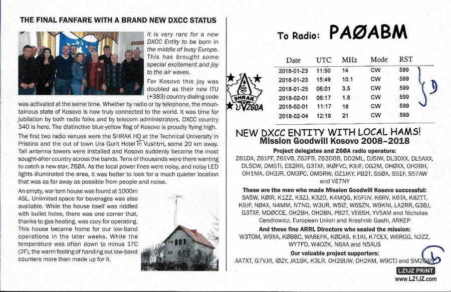 Veranderingen van 2016 t/m vandaagEntiteiten januari 2016: Actief 340, Verwijderd 61, Afgevoerd 9Kingman Reef DeletedIn 2016 moest Kingman Reef (KH5K) er aan geloven. het bestuur van dit Rif werd toevertrouwd aan de instantie die ook nabijgelegen Palmyra & jarvis Islands bestuurde.. Dit was de melding die de ARRL uitbracht op 28 maart 2016The ARRL Awards Committee has voted to delete Kingman Reef (KH5) from the DXCC List, effective March 29, 2016. Kingman Reef will be added to the Deleted Entities List on March 29, 2016. The total number of entities on the List will drop from 340 to 339. The deletion process is described in DXCC Rules Section II DXCC List Criteria, Part 5(a) Deletion Criteria.QSOs met Kingman Reef (KH5K) tellen tot 28 maart 2016 voor het DXCCEntiteiten januari 2017: Actief 339, Verwijderd 62, Afgevoerd 9The Midway - Kure verwijdering in 2017In 2017 plaatste de ARRL een melding, gedateerd 31 maart 2017. Die aankondiging zorgde ervoor dat nog twee Entiteiten, Midway sland (KH4) en Kure Atol (KH7) ook op de Deleted lijst terecht kwamen.Midway and Kure Islands have been placed on the list of DXCC deleted entities, effective August 26, 2016. This came about as an unintended consequence of action last summer by then-President Barack Obama that expanded the Papahānaumokuākea Marine National Monument to include the northwestern Hawaiian Islands west of Ni’ihau Island, making it the largest contiguous protected conservation area under the US flagMaar de ARRL trok de verkeerde conclusie. Bill Kennamer, K5FUV, die jaren lid was geweest van het DXAC, was het niet eens met de beslissing van de ARRL. Zijn argument was dat Midway nooit een deel is geweest van Hawaii maar altijd apart werd bestuurd. Eerst was het atol een US Marine basis, bestuurd door de U.S. Navy, en later onder beheer kwam van de U.S. F&WS, (U.S. Fish and Wildlife Service). Daarom kon Midway, door de actie van President Obama reglementair NIET verwijderd worden uit de DXCC Countries List. En daarom moest Kure ook in deze lijst blijven staan.De ARRL gaf hierop het volgende antwoord.After further review it has been found that the deletion of these two entities is not supported by the changes that were made to the relevant administrations. Therefore, the deletions from the DXCC list should not have occurred and the two entities, Midway Island KH4 and Kure Island KH7K, will return to the DXCC list as separate entities.QSO’s met Midway (KH4) en Kure Island (KH7) blijven dus geldig vanaf 15 november 1945Dit trouwens niet de eerste keer dat een Entiteit werd verwijderd en later weer terugkeerde naar de DXCC lijst. Het gebeurde ook bij het verwijderen van de Kaaiman eilanden in 1960. Maar wie herinnert zich dat nog? (DX is !!)Entiteiten januari 2018: Actief 339, Verwijderd 62, Afgevoerd 9De laatste Balkan Entiteit krijgt de DXCC statusOp 17 februari 2008 verklaarde Kosovo zich onafhankelijk van Servië. Helaas was dit feit niet voldoende om Kosovo aan de DXCC Countries List toe te voegen. Er kon namelijk geen Event Date vastgesteld worden. Een Event Date is of de dag dat een Entiteit lid wordt van de Verenigde naties of de dag dat een officiële prefix door de ITU wordt toegewezen.Bill Moore, NC1L van de ARRL deed de volgende uitspraak in september 2012.;Congratulations to the team which helped to reintroduce Amateur Radio to Kosovo, and welcome back to the airwaves to the returning Hams. As of this time Z60K, and/or any other Z6 station, will not count for any entity for DXCC awards purposes as they do NOT qualify under the DXCC rules. Any future change in Kosovo's DXCC status will be announced by ARRL.In 2013 telde de Verenigde Naties 103 leden welke Kosovo erkenden als onafhankelijke natie. Echter Rusland, Servië en enkele andere landen deden dat niet. En omdat Rusland vetorecht heeft was toevoegen van Kosovo als nieuwe DXCC Entiteit, reglementair niet mogelijk.Er zijn ook vijf landen welke behoren tot de Europese Unie, die Kosovo niet erkennen; Cyprus, Griekenland, Roemenië, Slowakije en Spanje. Waarom niet? Geen van die landen zijn bondgenoten van Servië, Rusland of China). Het is echter geen zaak van Kosovo ’s onafhankelijkheid maar meer een lokale politieke kwestie.De ARRL Board of Directors vonden een oplossing voor dit vetorecht dillema, en voegde deze nieuwe deelsectie (sectie (d)) toe aan het DXCC reglement;The entity has a separate IARU member society and is included on the US State Department Independent States in the World. In de vergadering van de ARRL waar deze toevoeging werd behandeld en werd goedgekeurd, werd niet over een bepaalde Entiteit gesproken. (lees Kosovo). Maar het mag duidelijk zijn dat toevoeging van subsection (d), de weg vrij maakte voor uitbreiding van het aantal Entiteiten in de DXCC Countries List. De vergadering vond plaats op 20 januari 2018 QSO’s met Kosovo (Z6) tellen voor DXCC vanaf de nieuwe Event Date, 21 januari 2018.De toevoeging van Kosovo aan de DXCC maakt duidelijk dat het DXCC niet zomaar een stukje papier is dat je kunt inlijsten en aan de muur hangen. DXCC is niet alleen maar het bewijs dat je contact hebt gehad met diverse plekken op de wereldbol. Nee,DXCC is meer dan dat DXCC is was het is, DXCCEntiteiten januari 2019: Actief 340, Verwijderd 62, Afgevoerd 9Van 2019 t/m 2022 werd er weer niets veranderd aan de DXCC lijst.De toekomstWelke wijzigingen staan ons in de toekomst nog te verwachten? Dat weet natuurlijk niemand. De DXCC-zoekers schijnen in slaap te zijn gevallen, of kunnen niets meer bedenken om het DXCC vuurtje op te porren. DXCC is !!Tot de volgende wijziging van het DXCC, Stay tuned.DXCC wijzigingen 2016-Nu Entiteiten tot vandaag: Actief 340, Verwijderd 62, Afgevoerd 9DX is.. !!, vy 73, PA0ABM