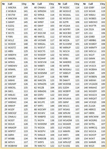 Nog wat reglement wijzigingen in 1938Eind 1938 stonden in het jaarlijkse DXCC overzicht 80 calls genoemd die 100 of meer landen hadden bevestigd. De lijst was gesorteerd (zoals gebruikelijk) op aantal bevestigde landen. De lijst werd aangevoerd door G6WY(5) met 140 landen. De tweede Europeaan was ON4AU(40) op de negende plaats met 125 landen. Onze Ed, PA0XF(43) stond op plaats 46 met 105 bevestigde landen. Tussen haakjes is het DXCC-lid-nummer genoemd.Ook was in het december 1938 nummer van QST een aangepast DXCC reglement te vinden, dat intussen was gegroeid tot 14 artikelen. De belangrijkste wijzigingen waren:a). IIn landen waar vergunningen op normale manier werden toegekend mochten alleen QSLs van stations uit die landen worden ingezonden ter controle.b). Bij elke aanvraag voor het DXCC of voor extra bevestigingen moest ook een lijst worden meegestuurd waar alle claims op te vinden waren. Die lijst kon dan voor toekomstige claims worden gebruikt.Gebruik van gewijzigde Amerikaanse prefixenHet ging langzaam met de prefix-wijzigingen van de Amerikaanse stations in de Stille Zuidzee en de nabije bezittingen zoals Porto Rico en de Amerikaanse Viginia Eilanden.. Nieuwe calls moesten namelijk worden aangevraagd bij de F.C.C. voordat je met de nieuwe prefix actief mocht zijn.Er werd geen lijst bijgehouden van aanpassingen aan de ARRL Countries List. Dat moest je dus zelf maar bijhouden, anders zou je wel eens een ex-land (zoals Oostenrijk) over het hoofd kunnen zien..In 1938 werden 958 W.A.C. certificaten uitgereikt. De meeste aanvragen kwamen uit Engeland (95), gevolgd door België (36) en Duitsland (23). Er werden in 1938 16 WAC certificaten aan Nederlanders uitgereikt, 10 in CW en 6 in Phone (AM). Calls van deze stations zijn niet bekend.BedrogDoor het DXCC certificaat was de vraag naar QSL kaarten voor de bevestiging van het QSO flink toegenomen. Want alleen door deze QSL kaarten op te sturen naar de ARRL kon je bewijzen dat je met het geclaimde land een verbinding had gemaakt. En als je in een zeldzaam land woonde, dan werd al “jacht” op je gemaakt. Dit veroorzaakte wel zeer bekende gevolgen, zoals de activiteit van “Phonies” ofwel het product van iemands verbeelding.In mei 1939 stonden er 123 calls genoemd in de DXCC lijst. En een groot aantal had al een aanvraag ingestuurd om aspirant lid te mogen worden. Ze hadden natuurlijk al minstens 75 DXCC landen bevestigd.Geloof het of niet, maar een paar vooraanstaande Big Gun DX stations probeerden hun score in de maandelijkse lijst te verbeteren door QSL kaarten handmatig te wijzigen. En dat was natuurlijk niet de bedoeling. Het logische gevolg was dat hiervoor werd gewaarschuwd. Elke wijziging of vervalsing van QSL kaarten zou als gevolg hebben dat de call van de valsspeler uit de DXCC lijst zou verdwijnen, en dat de frauderende amateur geen DXCC lid meer kon worden.De ARRL werd verweten dat het genoemde bedrog niet waar was. De DXCC leden waren bang dat hun call uit de lijst zou verdwijnen en controleerden de ledenlijsten zeer uitvoerig. Maar niemand kon zeggen dat zijn call uit de lijst geschrapt was. Die controle was niet eenvoudig. Even van een bladzijde van QST een foto-kopie maken ging niet. Als je jouw QST blad niet wou beschadigen dan moest je de lijsten overtypen, Pas daarna kon je calls tegen elkaar wegstrepen. Met potlood natuurlijk wan de balpen was nog maar net in 1938 uitgevonden. De balpen lekte echter nog teveel. Een commercieel product kwam pas beschikbaar na de tweede wereldoorlog. Toch was het bedrog waar zoals in de rubriek “How’s DX” van het juni 1939 van QST stond vermeld. Hier is de volledige tekst.A few months back, mention was made that some of the DXCC guys were going to be dropped because they had been caught altering cards submitted in evidence. Apparently this little item caused some of the lads to check up immediately on the list to see if they were the ones left off, or to see if they could find who the rodents were. When they finally determined that no one had been dropped, they wrote in and accused us of running a bluff. No bluff, my hearties - it just takes a little time to check on some of these things. You'll find a few missing right now. Go ahead and check up; we'll wait for you.You found them, did you? Well, we could have saved you the trouble by naming them outright, but we've decided never to mention them again on this page. We don't go much for fellows that attach so much importance to their relative standing on the DXCC list that they cheat to beat out their fellow hams. In the immortal words of that sage of radio, W1QV: "After all, it's only a hobby."DX is !! AllwaysIn het augustus 1939 nummer van QST verscheen de laatste genummerde DX Century Club List. In latere lijsten werd het DXCC nummer steeds weggelaten. Het laatst bekende Prewar DXCC nummer is 156, uitgegeven aan W1ZI (100 countries). PA0QF haalde de 100 net niet. Hij had 99 bevestigde landen, en kwam dus nog niet op de genummerde lijst voor.PA0XF, Ed, was daarom de enige Nederlander van wie het vooroorlogse DXCC nummer bekend is. Nr.43.Het rommelt in de WereldIn Europa vielen troepen van de Duitse Wehrmacht op 1 september 1939 Polen binnen. Dit leidde op 3 september 1939 tot een oorlogsverklaring aan Duitsland door het Verenigd Koninkrijk en Frankrijk. WW-II was begonnen.Natuurlijk had dit invloed op het zendamateurisme. De Amerikanen werden gevraagd neutraal te blijven. De schaduw van de oorlog was direct waarneembaar in de hobby. Ondanks het feit dat Engeland en Frankrijk in oorlog zijn waardoor deze landen en hun bezittingen uit de lucht zijn was er nog activiteit uit deze bezittingen. België en Nederland waren nog neutraal,maar er vonden geen zendactiviteiten meer plaats. Zendamateurs in Nederland waren met ingang van 30 Augustus 1939 uit de lucht. Van de 204 landen, die herkenbaar waren aan hun eigen prefix(en), waren er nog maximaal 115 actief op de banden. Ook Zuid Afrika stopte met ingang van 29 oktober met zendactiv