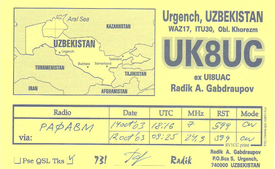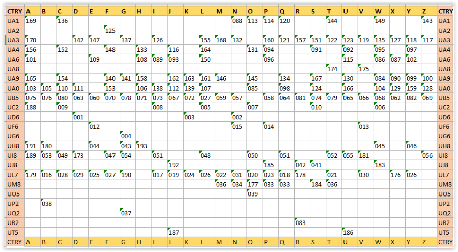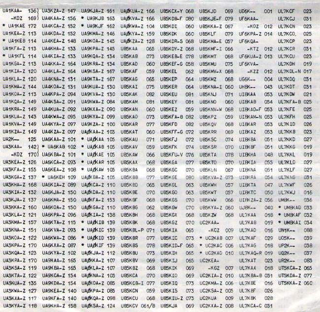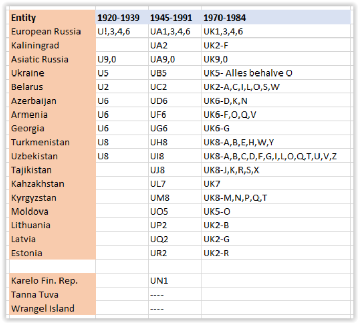 Voor de Tweede WereldoorlogIn 1927 gaf de ITU een document uit waarin te lezen was welke prefixblokken aan een land waren toegewezen. Die leek veel op de lijst hiernaast. Sommige landen (die hele grote) kregen zelfs meer dan een prefixblok toegewezen. Elk land had zijn eigen unieke radio-roepletters, begrenst door het toegewezen ITU-Prefixblok. De USSR kreeg het prefixgebied RAA-RZZ en UAA-UZZ toegewezen. Het gebied RAA-RZZ werd gebruikt voor commerciële doeleinden (schepen, vliegtuigen enz.), UAA-UZZ was voor de zendamateurs. De suffix (het persoonlijke deel van de roepletters) mocht zelf gekozen worden. Dat kon dus voor de Sovjet-Unie gebruikt worden voor een eigen sub verdeling, in republieken, steden, in Kraj, e.d.Estland, Letland en Litouwen waren geen republieken van van de USSR maar zelfstandige landen. In de DXCC landelijst van 1937 hadden zij hun eigen prefixen, ES, YL en LY. En landen of republieken zoals Kazakhstan, Turkoman, Uzbekistan enz kwamen nog niet voor in dez DXCC lijst.Na de Tweede WereldoorlogWereldoorlog II had tot gevolg dat Estland, Letland en Litouwen werden geannexeerd door Rusland en in de Russische Federatie werden opgenomen. In deze federatie, met de naam USSR (Union of Sovjet Socialist Republics), waren 15 deelstaten opgenomen. In de In de naoorlogse DXCC Country List, die op 15 november 1945 officieel werd, waren al deze deelstaten als apart land (nu Entiteit), elk met hun eigen prefix, opgenomen. Behalve deze 15 deelstaten werden nog een paar deelgebieden aan de DXCC lijst toegevoegd. Voor het DXCC bestond de Sovjet-Unie daarom uit 20 CountriesDe Sovjet-Unie volgens de DXCC lijst van 1945In de lijst van de ARRL begonnen alle Prefixen van de USSR met een U, gevolgd door onderstaande letters.UA = Russian SFSRUA1,3,4,6 = Europees RussiaUA2= KaliningradUA9,0= Aziatisch RussiaU?= Alma AtaU?= Wrangel IslandUB,= Ukrainian SSRUC = Byelorussian SSRUD = Azerbaijan SSRUF= Georgian SSRUG = Armenian SSRUH = Turkmen SSRUI = Uzbek SSRUJ = Tadzhik SSRUL = Kazakh SSRUM = Khirghiz SSRUN= Karelia RepublicUO = Moldavian SSRUP = Lithuanian SSRUQ = Latvian SSRUR = Estonian SSRRoepletters na de tweede WereldoorlogGedurende de periode van 1945 tot 1969 hadden USSR-clubstations een suffix van 3 letters. De eerste letter van de suffix was altijd de letter ‘K’. Gewone stations hadden een suffix van 2 letters. Van de gewone calls was het niet mogelijk de oblast te bepalen.The DXNS U.S.S.R. OBLAST GUIDE (tot 1970), van Geoff Watts, BRS-3129,De tabel van Geoff Watts toont een overzicht van de toewijzing van roepletters aan een amateur uit de Sovjet-Unie (overgenomen uit Clublog). De toegewezen call was afhankelijk van het gebied waar je woonde. Privé roepletters bestonden direct na de tweede wereldoorlog haast niet. Zendamateurs waren lid van een club, En dat het een clubstation was kon je herkennen doordat de suffix begon met de letter >>K<<. Het nummer wat in de tabel hierboven achter de roeplettergroep staat is de Stad, Oblast, Regio of Republiek waar het station zich bevindt.In 1970 veranderden de calls van de Sovjet-Unie. De letter K als indicatie voor een clubstation verdween uit de suffix en werd deel van de prefix. Alle clubstations kregen nu een prefix welke begon met UK. Het cijfer in de call gaf nog steeds het geografisch gebied aan waar de amateur zich bevond. En de eerste letter van de suffix werd gebruikt om de oblast of regio binnen dat geografisch gebied aan te geven. Dat was identiek voor zowel clubstations als privé stations. In de tabel links geeft de letter achter de UK prefix de Regio of Oblast waar het station gelokaliseerd was. Doordat de tweede letter van de prefix altijd een >>K<< was ontstond het probleem dat de prefix nu voor meer SSR republieken hetzelfde was. Zo werd het cijfer 6 gebruikt voor clubstations in de republieken Azerbaijan, Georgia en Armenia. De prefixen UK2, UK5 en UK8 werden ook voor meerdere Sovjet republieken gebruiktJe had dus in die tijd een Veron Vademecumnodig om te kunnen bepalen waar het Sovjet Unie station thuishoorde waarmee je een QSO maakte. Maar calls welke begonnen met UK8 konden nog steeds voor vergissingen zorgen, want UK8A en UK8B waren roepletters die zowel in de republieken Turkoman als Uzbekistan werden gebruikt.De Karelo Finish Republik was tot 1964 een DXCC country. Tanna Tuva en Wrangel Island stonden ook op de DXCC lijst, maar deze twee zijn van die lijst verwijderd voordat iemand een QSO met deze gebieden kon claimen.Vanaf januari 1970 to April 1984 gebruikten clubstations de prefix UK, gevolgd door het cijfer dat bij de Entiteit hoorde. De suffix bestond weer uit 3 letters. (Zie de tabel hiernaast voor de oblast behorende bij de clubstations).Het R-6-K en R-15-U en R-100-O certificaat.Al voor de tweede wereldoorlog ontstond binnen de amateurwereld een behoefte zendamateurs te belonen als zij konden aantonen een verbinding te hebben gemaakt met amateurs uit bepaalde gebieden (landen, provincies, gemeenten enz.). Het bewijs van een verbinding was natuurlijk de QSL kaart, dat stukje papier of karton waarop gegevens van de gemaakte verbinding werden genoteerd en naar het tegenstation werd gestuurd. De meeste bekende beloning is natuurlijk het DXCC-certificaat. In Nederland kon je ook een certificaat aanvragen, het PACC certificaat, als je kon aantonen met minstens 100 verschillende Nederlandse amateurs een verbinding had gemaakt.De Sovjet-Unie had natuurlijk ook haar certificaten. Zo kon je het R-15-U certificaat aanvragen als je het bewijs had dat je met alle deelstaten van de Sovjet-Unie een verbinding had gemaakt. Het R-6-K, vergelijkbaar met het WAC award (Worked All Continents) was wat eenvoudiger te behalen. Moeilijker was het behalen van het R-100-O certificaat. Daarvoor moest je aantonen met minstens 100 verschillende gebieden (Oblasts) een QSO te hebben gemaakt. Kennis van Russische gebieden was dus noodzakelijk.Oblasts van 1970-1984 (april)De deelstaten van de Sovjet-Unie hadden tot 1970 elk hun eigen p