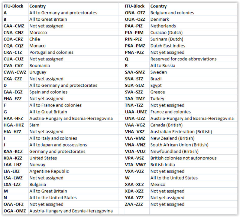DXCC-Countries G-NGalapagos Islands,Gambia, ZD3Germany, DGibraltar, ZB2Gilbert and Ellis Islands and Ocean Island, VR1Goa (Portuguese India), CR8Gold Coast (and British Togoland), ZD4Gough Island,Great Brittain, GGreece, SVGreenland, OXGuadeloupe, FG8Guam, K6Guatemala, TGGuiana, British, VP3Guiana, French, and Inini, FY8Guiana, Netherlands (Surinam), PZGuinea, Portuguese, CR5Guinea, Spanish, Haiti, HHHawaiian Islands, K6Hejaz, HZHonduras, HRHong Kong, VS6Hungary, HAIceland, TFIfni,India, VUInini, see Guana, French),Iran (Persia), EPIraq (Mesopotamia), YIIreland, Northern, GIIrish Free State, EIItaly, IJamaica and Cayman Islands, VP5Japan, JJava, PKKenya, VQ4Kerguelen Islands,Korea, see Chosen,Laccadive Islands,Latvia, YLLeeward Islands, VP2Liberia, ELLibya,Liechtenstein,Lithuania, LYLuxembourg, LXMacau, CR9Madagascar, FB8Madeira Islands, CT3Maldive Islands, VS9Malta, ZB1Manchukuo, (MX)Marianas Islands,Marshall Islands,Martinique, FM8Mauritius, VQ8Mesopotamia, see Iraq,Mexico, XEMidway Islands, K6Miquelon and St. Pierre Islands, FP8Monaco,Mongolia,Morocco, French, CNMorocco, Spanish, EA9Mozambique, CR7Nepal,Netherlands, PANetherlands West Indies , see Curacao, PJNew Caledonia, FK8New Foundland and Labrador,VONew Guinea, Netherlands, PK6New Guinea, Territory of, VK9New Hebrides, British,YJNew Hebrides, French,FU8New Zealand, ZLNicaragua, YNNicobar Islands,Nigeria (British Cameroons), ZD2Niue, ZK2Non-Federated Malay States, VS3North Borneo, see British North Borneo,Norway, LANyasaland, ZD6